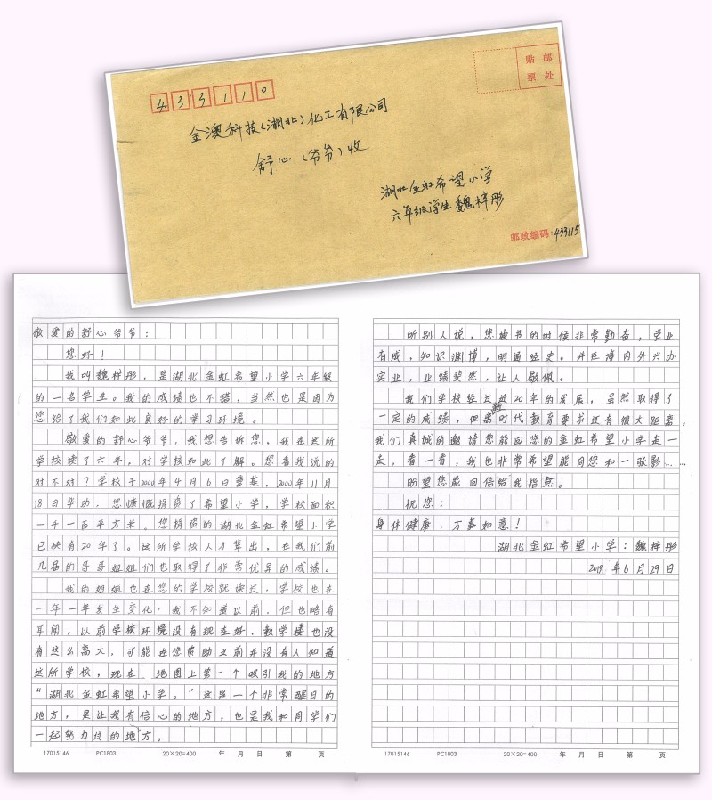 8月30日,高场办事处学区主任、湖北金虹希望小学校长周启安给金年会app下载官网ios送来了一封特别的来信。这是一封由湖北金虹希望小学六年级学生魏梓彤写给舒心主席的感谢信。