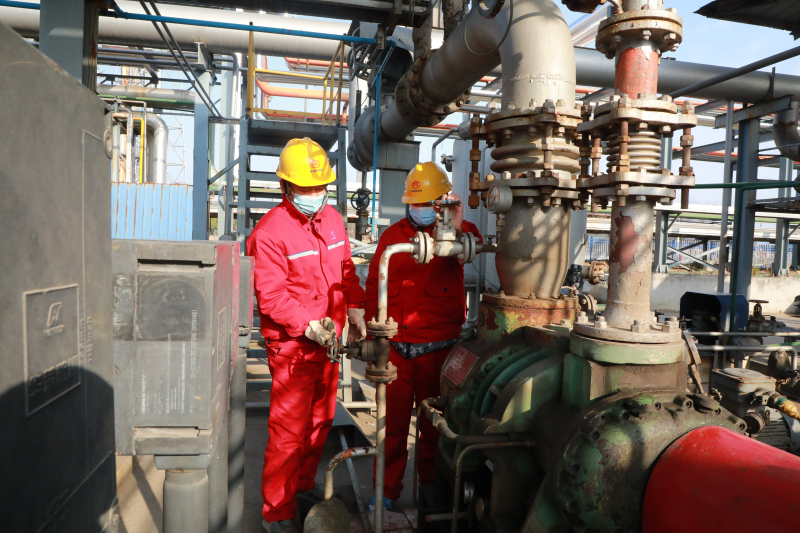 催化车间班员徐文俊、李永昌,在催化装置气柜区对压缩机进行柴油置换,确保压缩机正常运转。