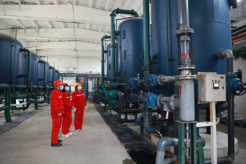 热能车间副主任李远林,党员、管理员李娟娟,主操何利容检查3#混床再生情况。
