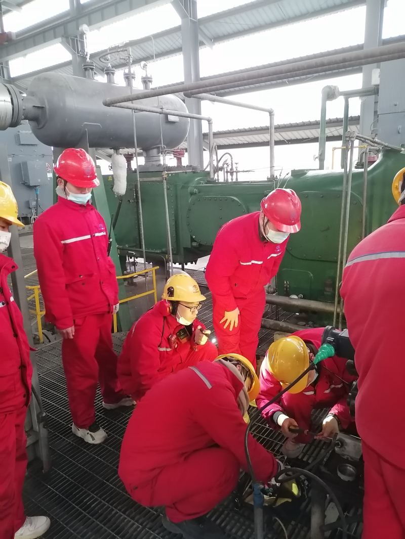 维修党支部委员、维修车间主任李辉,加氢车间副主任马自勇,设备机动处科员陈望现场监护加氢装置新氢压缩机A注油器更换工作。