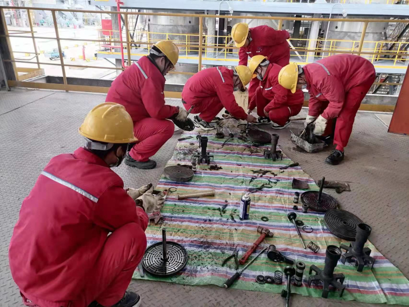 维修车间化工班主操刘涛带领班员郑港平、王治辉、邓超等,对芳构化装置富气压缩机气阀进行检修,确保机组安全稳定运行。