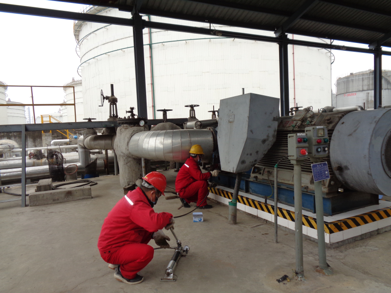 机修车间副主任刘艳华,堵漏班班员左浩对储运一公司新区原油岗30105#泵排凝管夹具泄漏点进行修补处理。