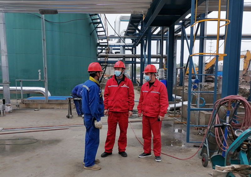 动力党支部书记、总经理王淼,支部委员、热能车间管理员刘伟,在新化水建设现场与外协施工人员进行安全交底。