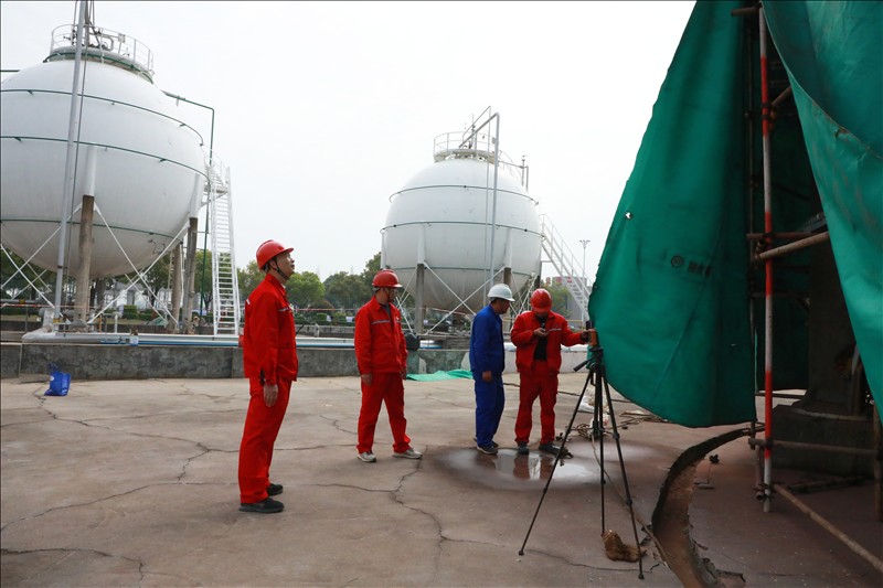 3月初,湖北省特检院直属分院得知金年会app下载官网ios6台球罐需腾空物料、置换进行定期检验后,为减少对企业生产物料存储和连续性生产造成影响,立即成立以曾一彪检验师为组长的项目部,主动热情为企业提供服务,并到检验现场商讨腾罐计划,决定采取逐台倒罐、检验师连续加班检验等方式满足企业生产所需,公司总裁助理郑经友、设备机动处处长郑玉兵配合检定。
