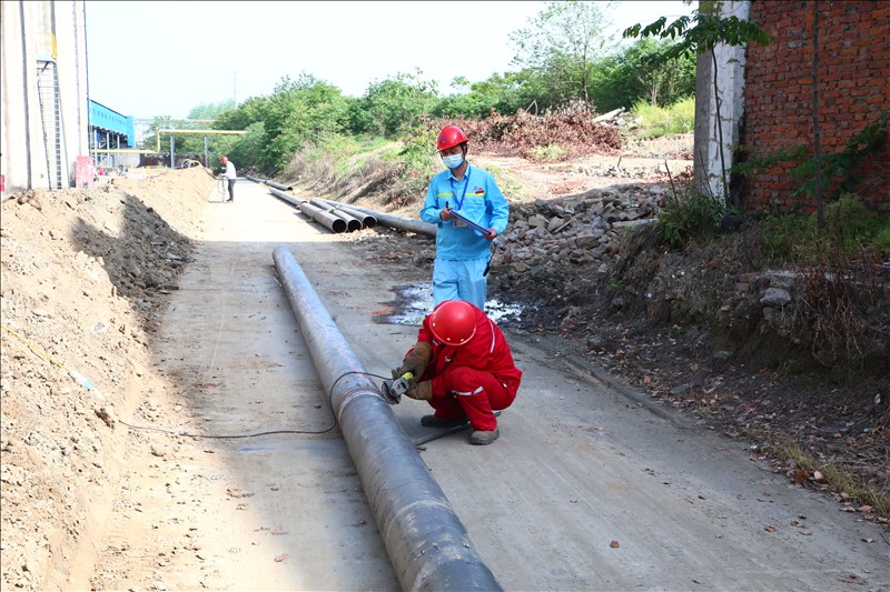 党员、油品储运一公司油品车间副主任张小平对系统管网除锈防腐施工进行安全监护。