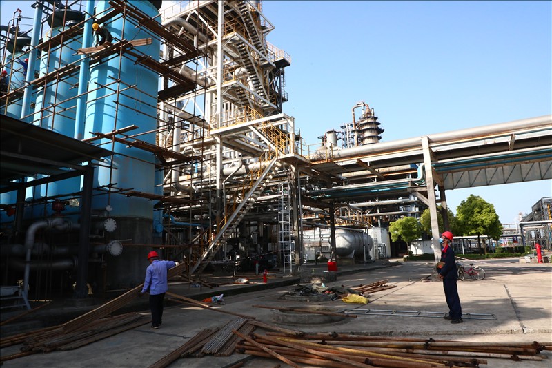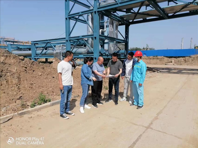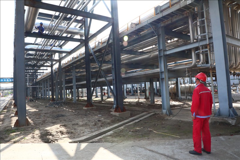 海润党支部委员、副总经理朱斌对甲醇制氢VPSA提氢塔搭架施工现场进行安全监护。
