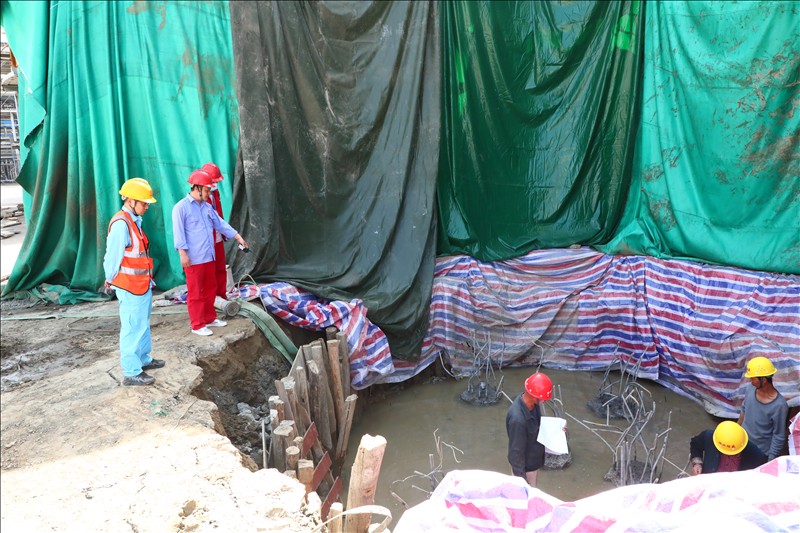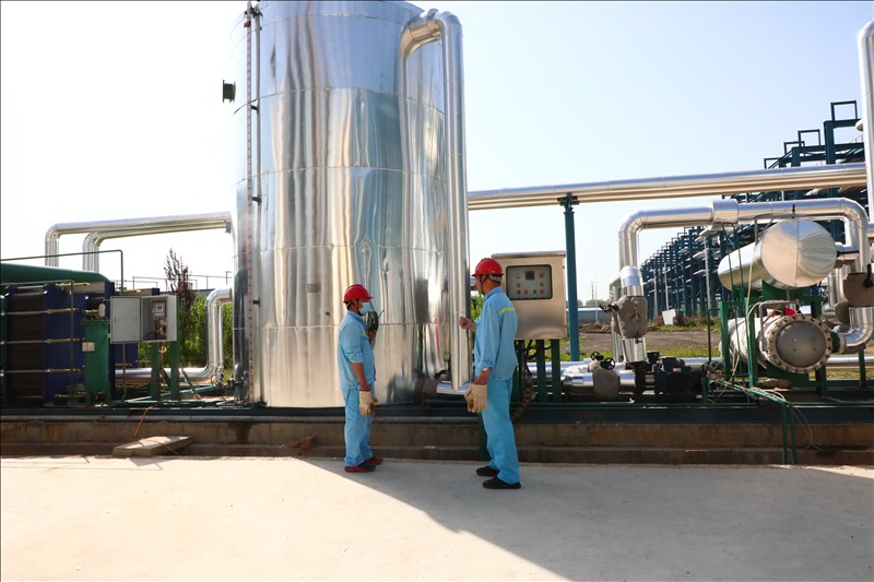 金达党支部委员、副总经理刘行平,异辛烷车间工艺管理员汪磊在凝结水站现场对含油及电导率偏高情况进行检查处理。