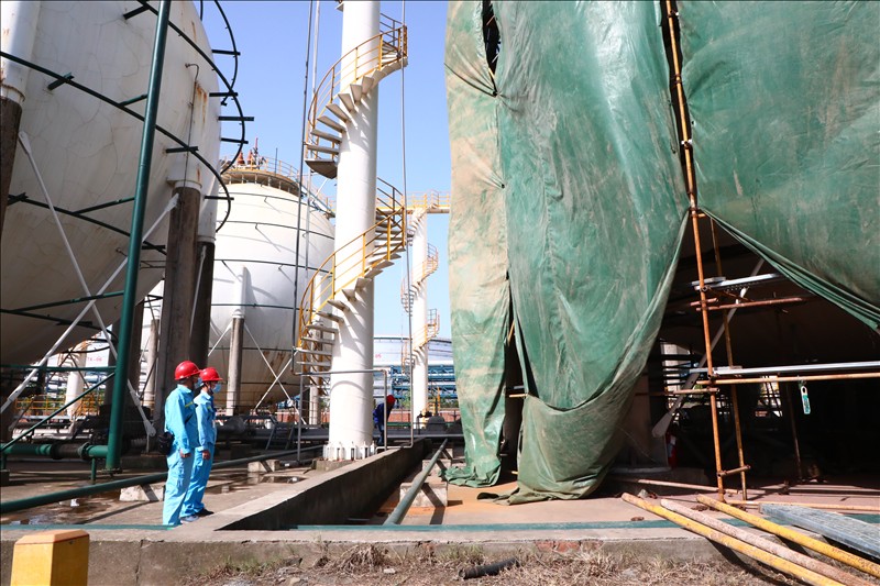 储运党支部书记、油品储运一公司总经理张大立,安全管理员周志邦对液化气30403#球罐检定打磨施工现场进行安全检查并监护。